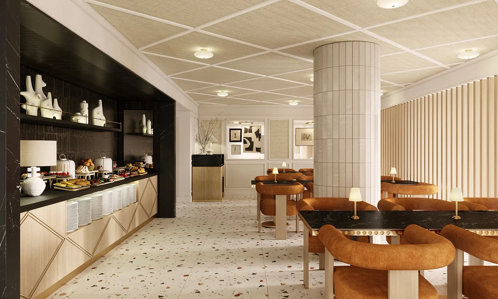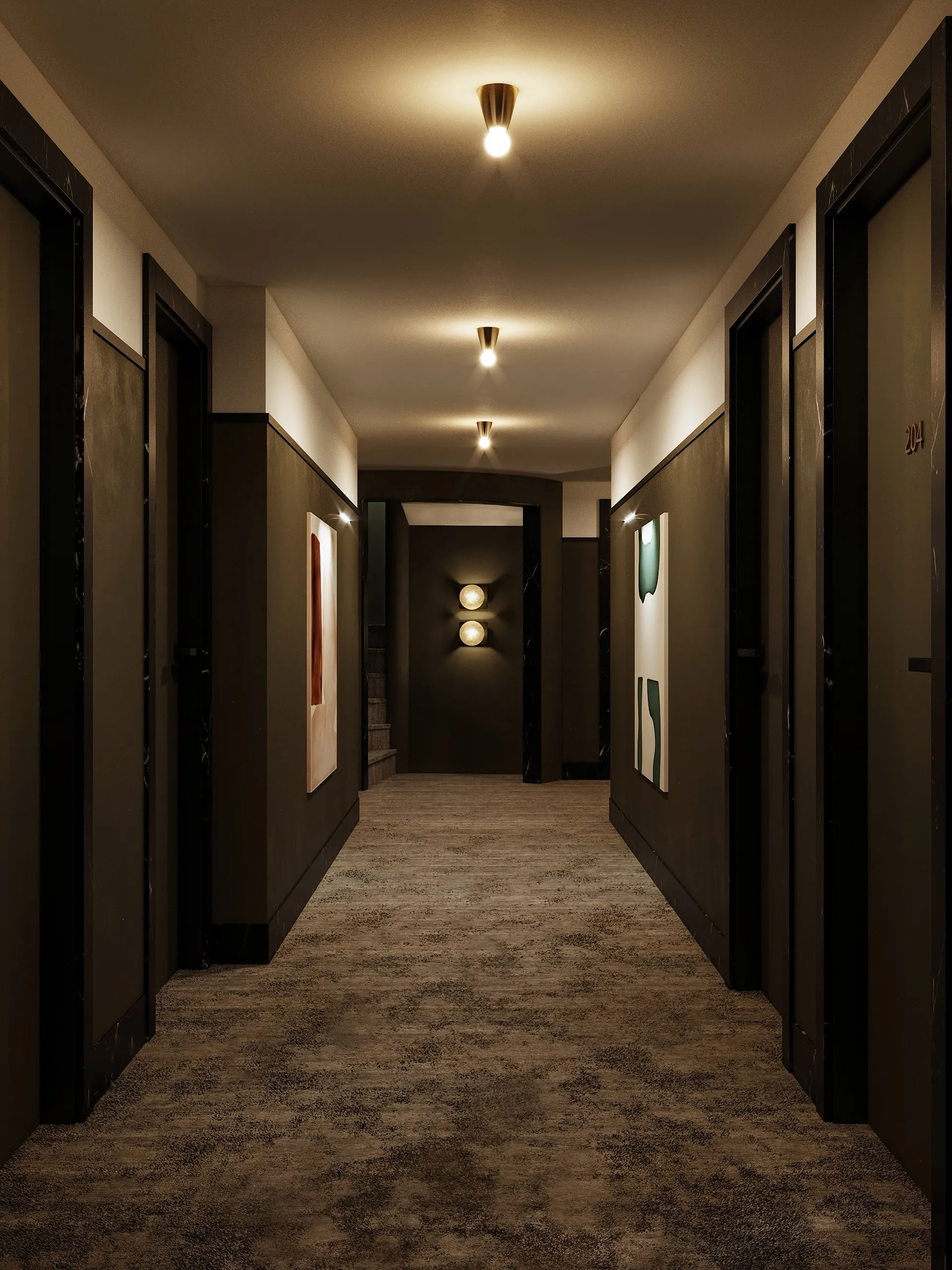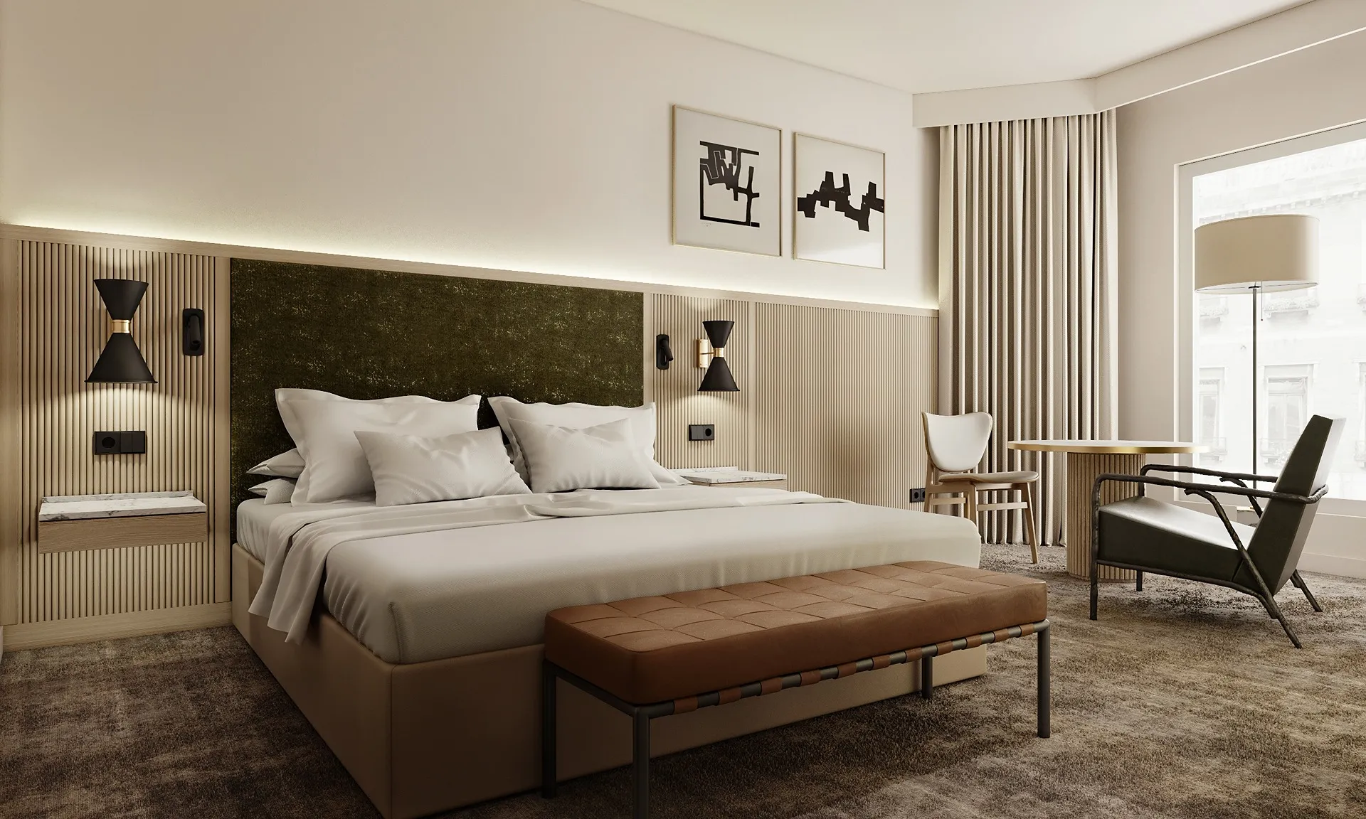 Tractant-se d’un establiment orientat principalment al públic de negocis, el disseny interior es planteja amb l’objectiu de crear un ambient acollidor on el client es pugui sentir a gust i relaxat. L’ús de materials càlids es combina amb una il·luminació indirecta acuradament dissenyada per afavorir una atmosfera serena i confortable, tant de dia com de nit.